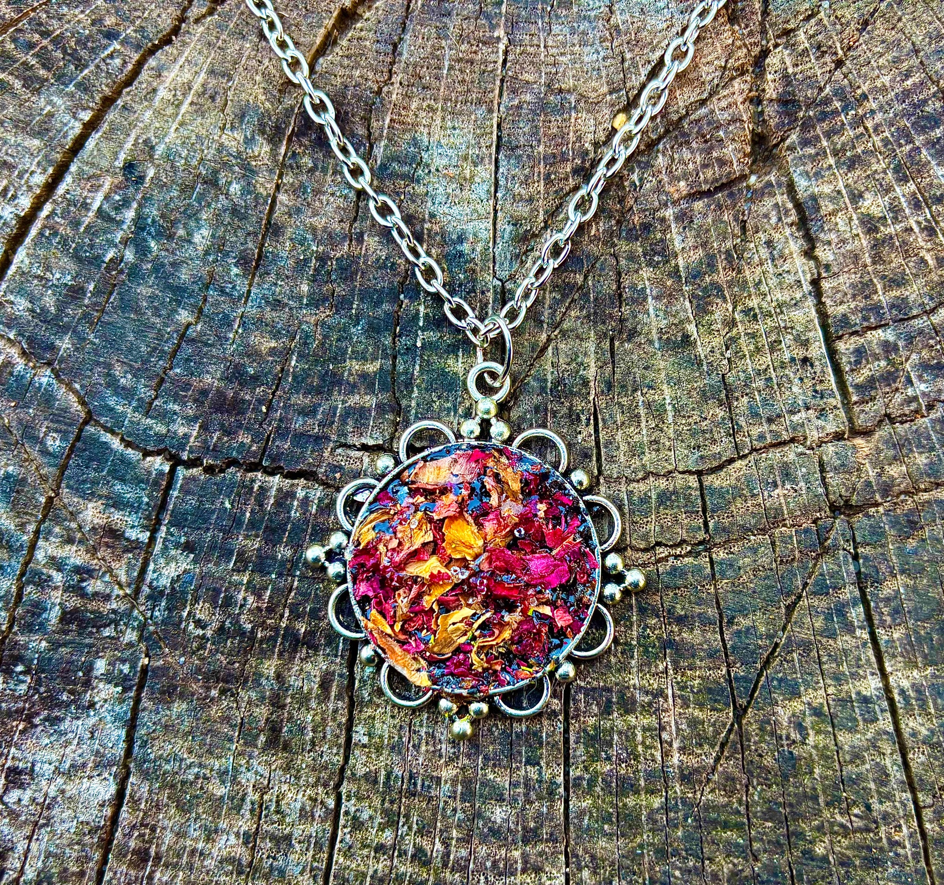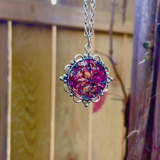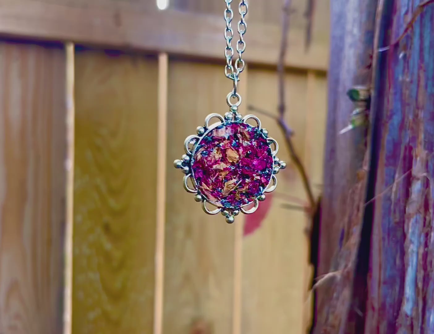 Step into enchantment with this one-of-a-kind pendant, lovingly handcrafted with real dried rose petals and grounding black tourmaline. Each piece is carefully sealed in resin and framed in an ornate silver-tone bezel, creating a stunning work of wearable art infused with both beauty and spiritual meaning.